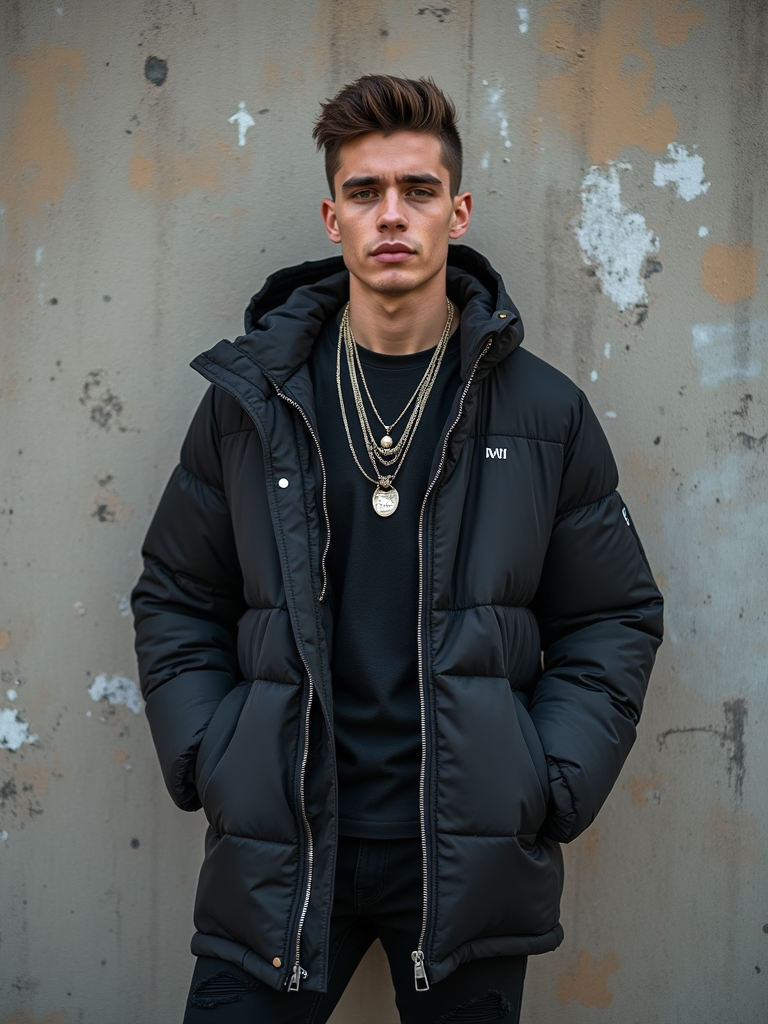 charismatic masculine model showing off an edgy streetwear look against an urban wall