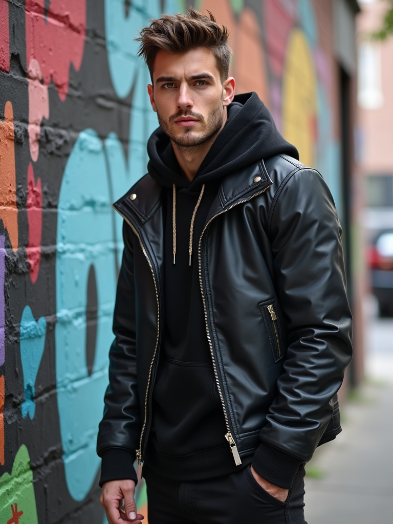 charismatic masculine model showing off an edgy streetwear look against an urban wall