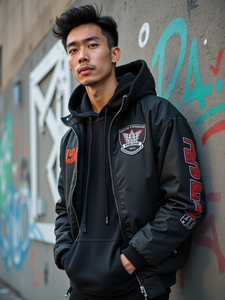 charismatic masculine model showing off an edgy streetwear look against an urban wall