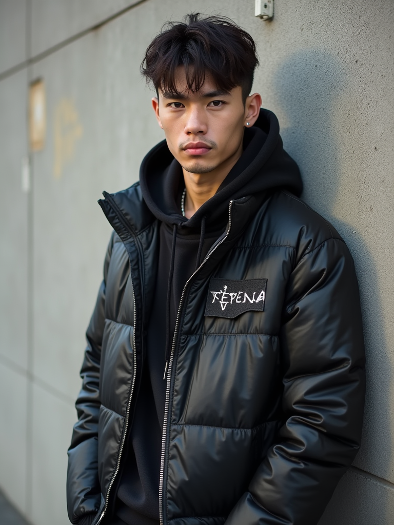 charismatic masculine model showing off an edgy streetwear look against an urban wall