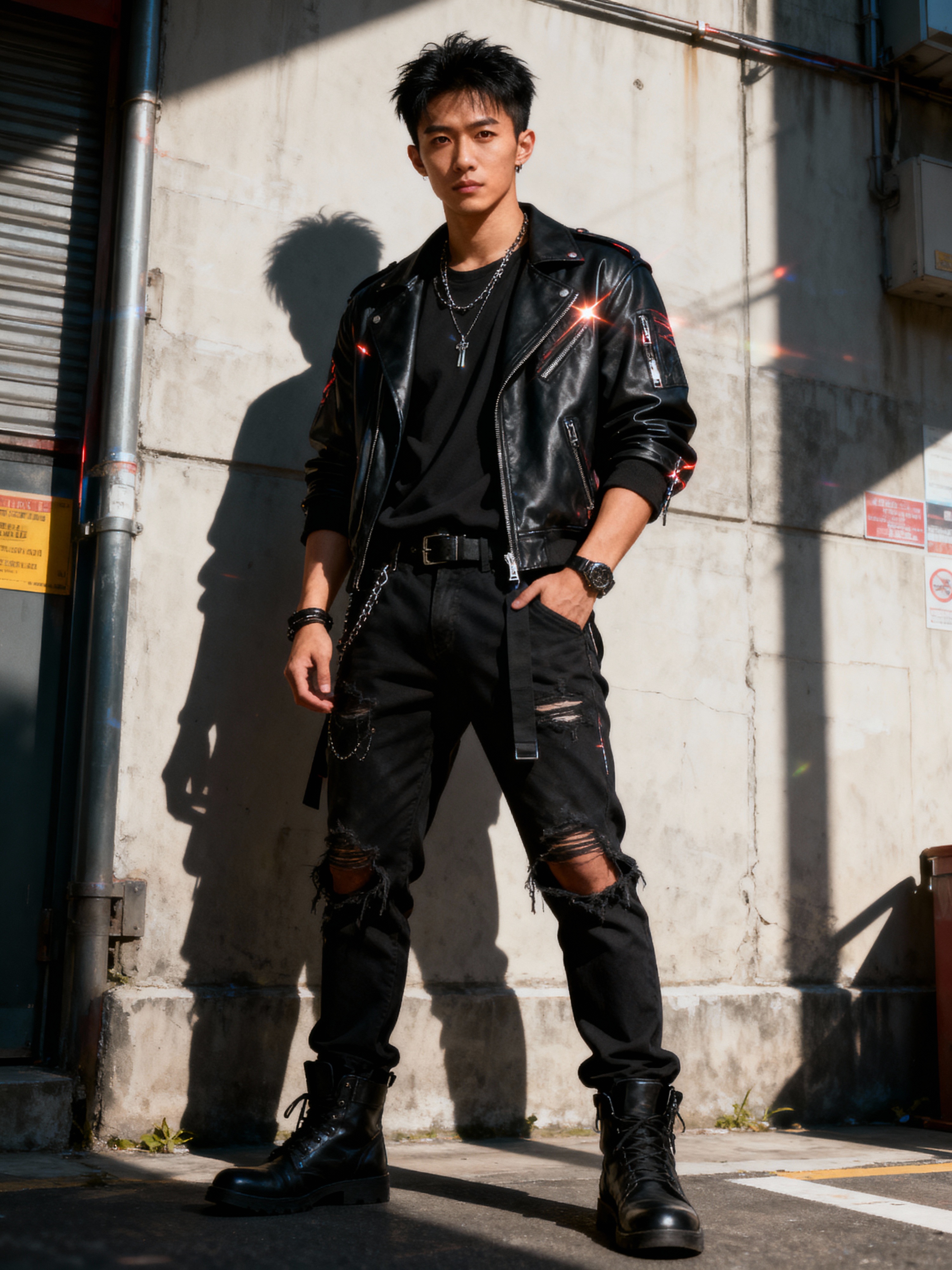 charismatic masculine model showing off an edgy streetwear look against an urban wall