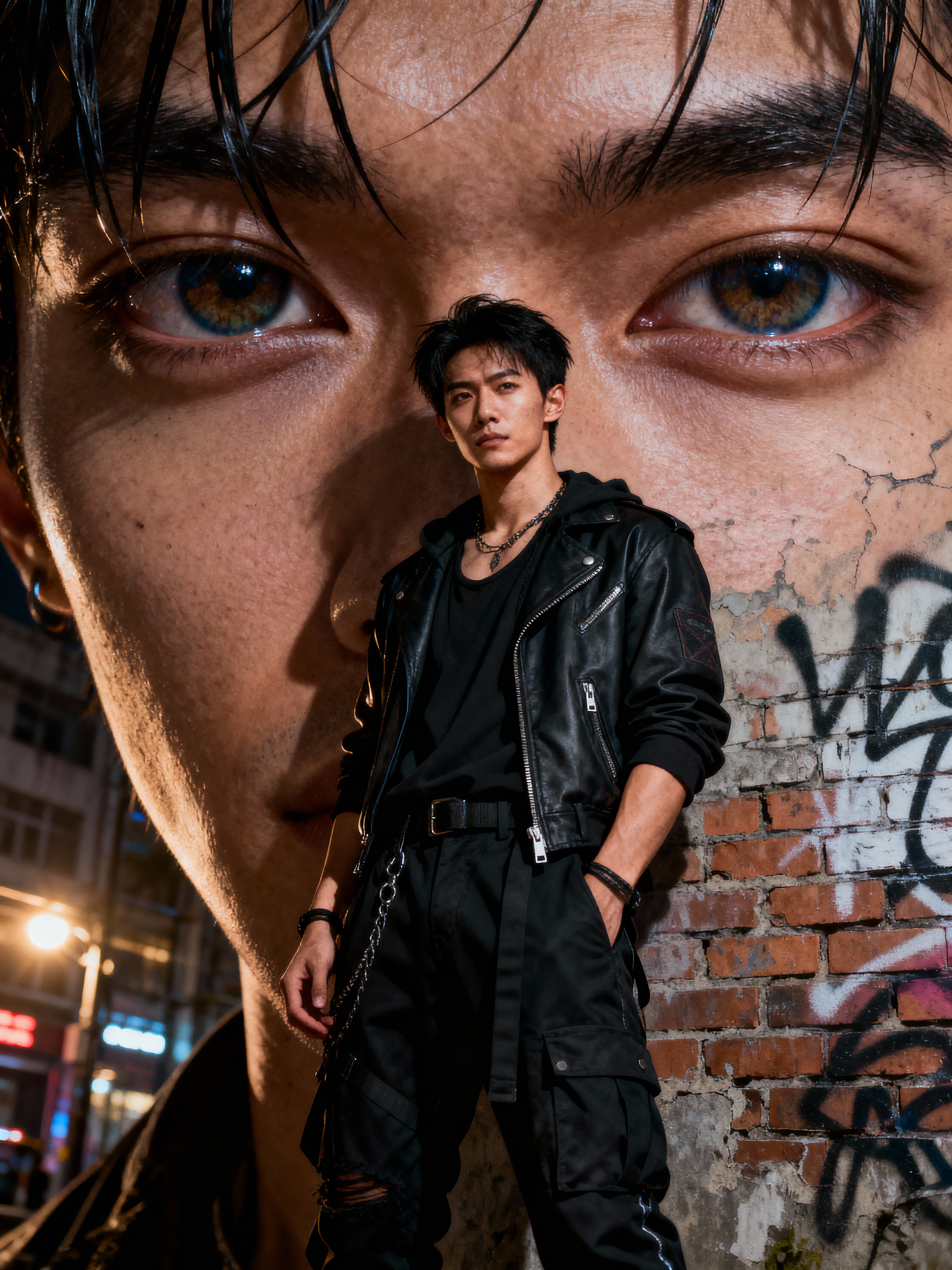 charismatic masculine model showing off an edgy streetwear look against an urban wall