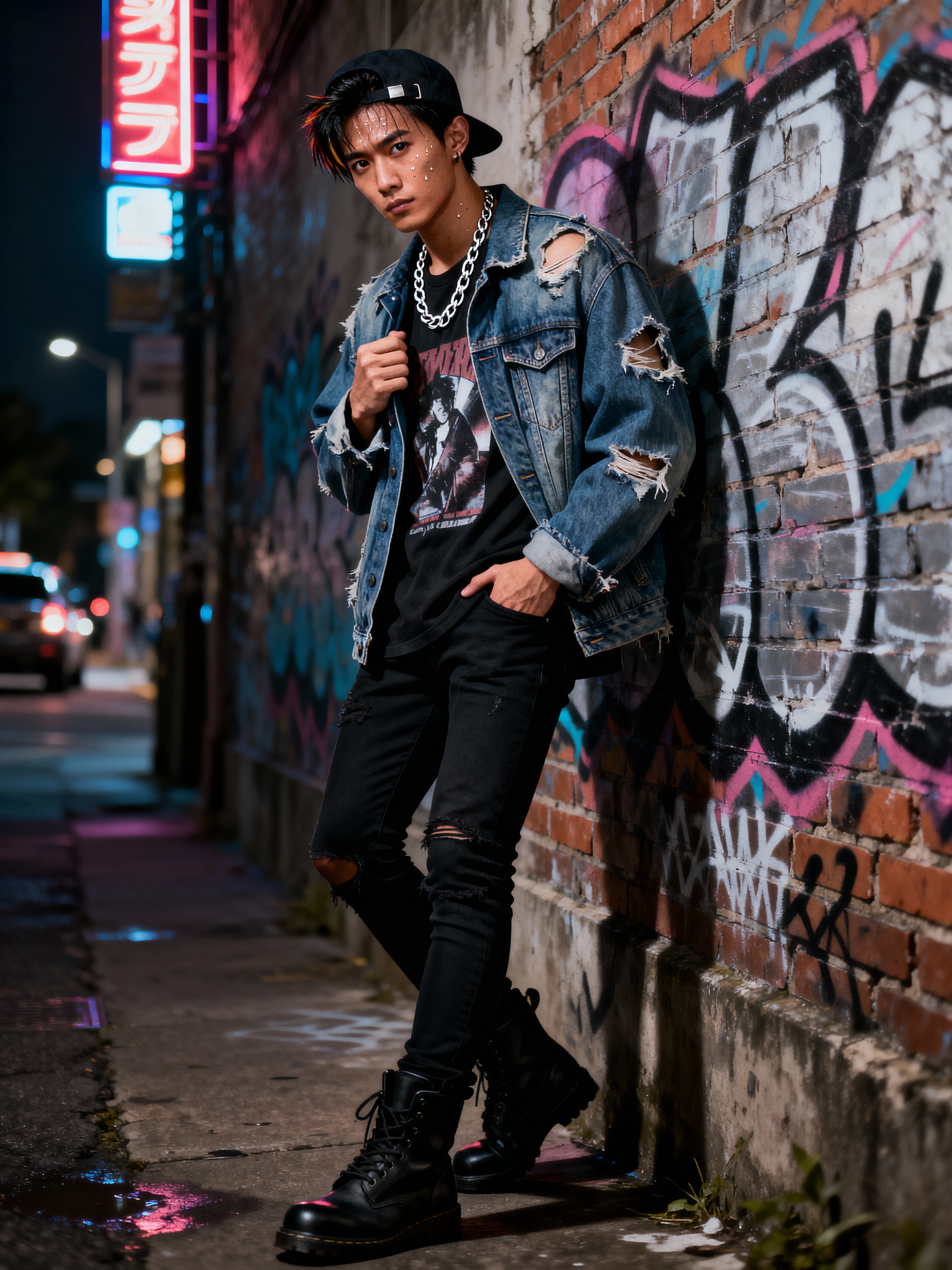 charismatic masculine model showing off an edgy streetwear look against an urban wall