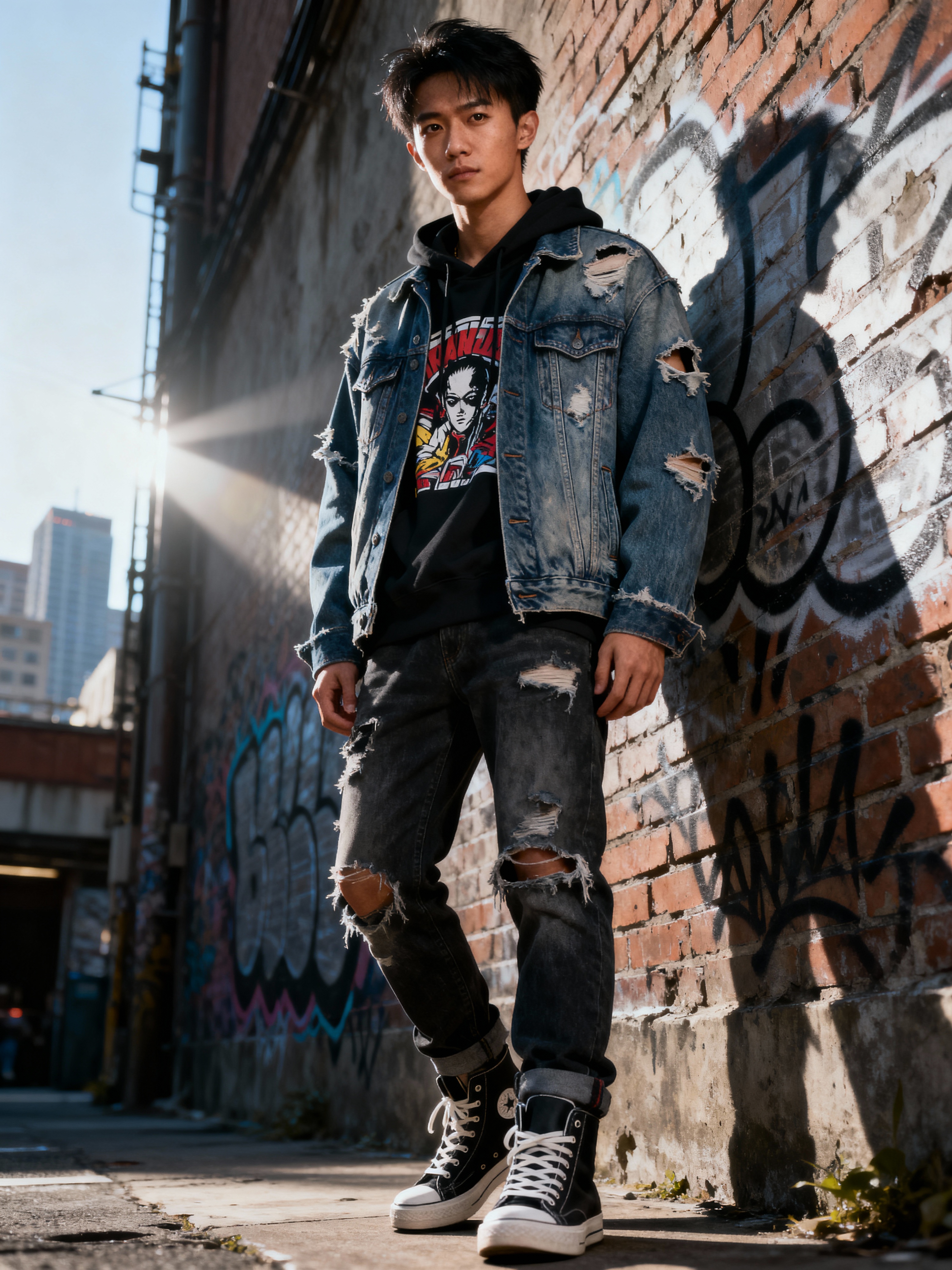 charismatic masculine model showing off an edgy streetwear look against an urban wall