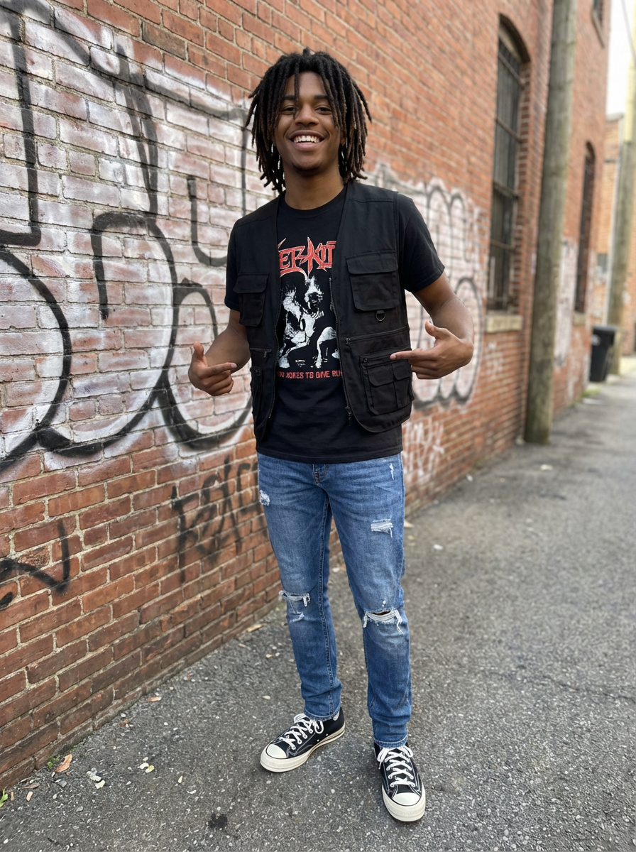 charismatic masculine model showing off an edgy streetwear look against an urban wall