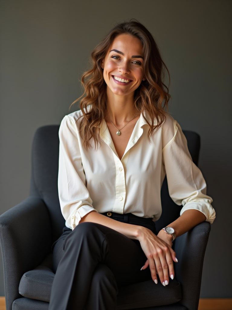 charismatic model dressed in chic blouse with tailored pants being interviewed, podcast studio setting, relaxed professional look