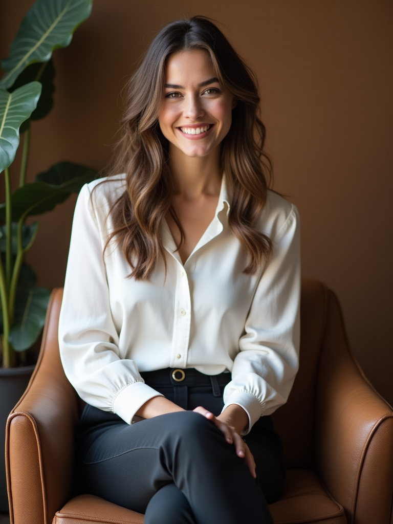 charismatic model dressed in chic blouse with tailored pants being interviewed, podcast studio setting, relaxed professional look