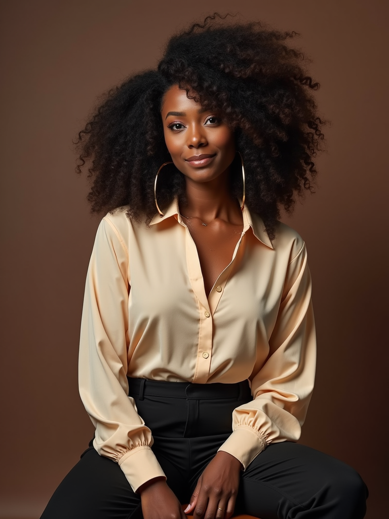 charismatic model dressed in chic blouse with tailored pants being interviewed, podcast studio setting, relaxed professional look
