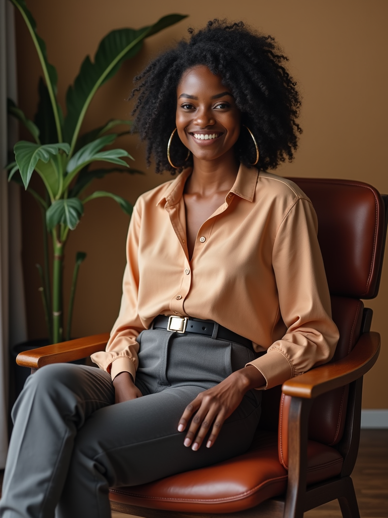 charismatic model dressed in chic blouse with tailored pants being interviewed, podcast studio setting, relaxed professional look