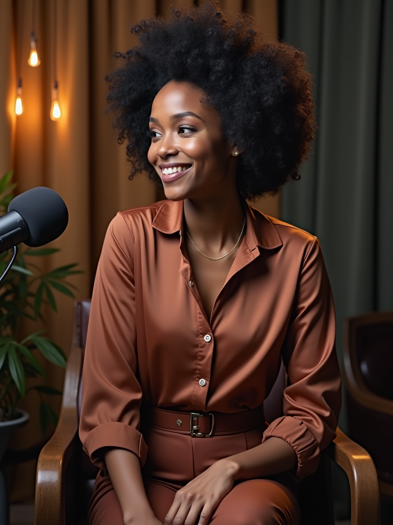 charismatic model dressed in chic blouse with tailored pants being interviewed, podcast studio setting, relaxed professional look