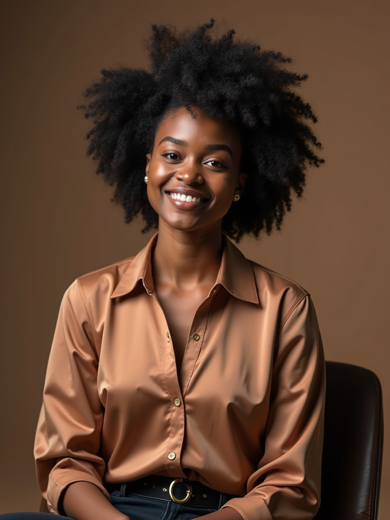 charismatic model dressed in chic blouse with tailored pants being interviewed, podcast studio setting, relaxed professional look
