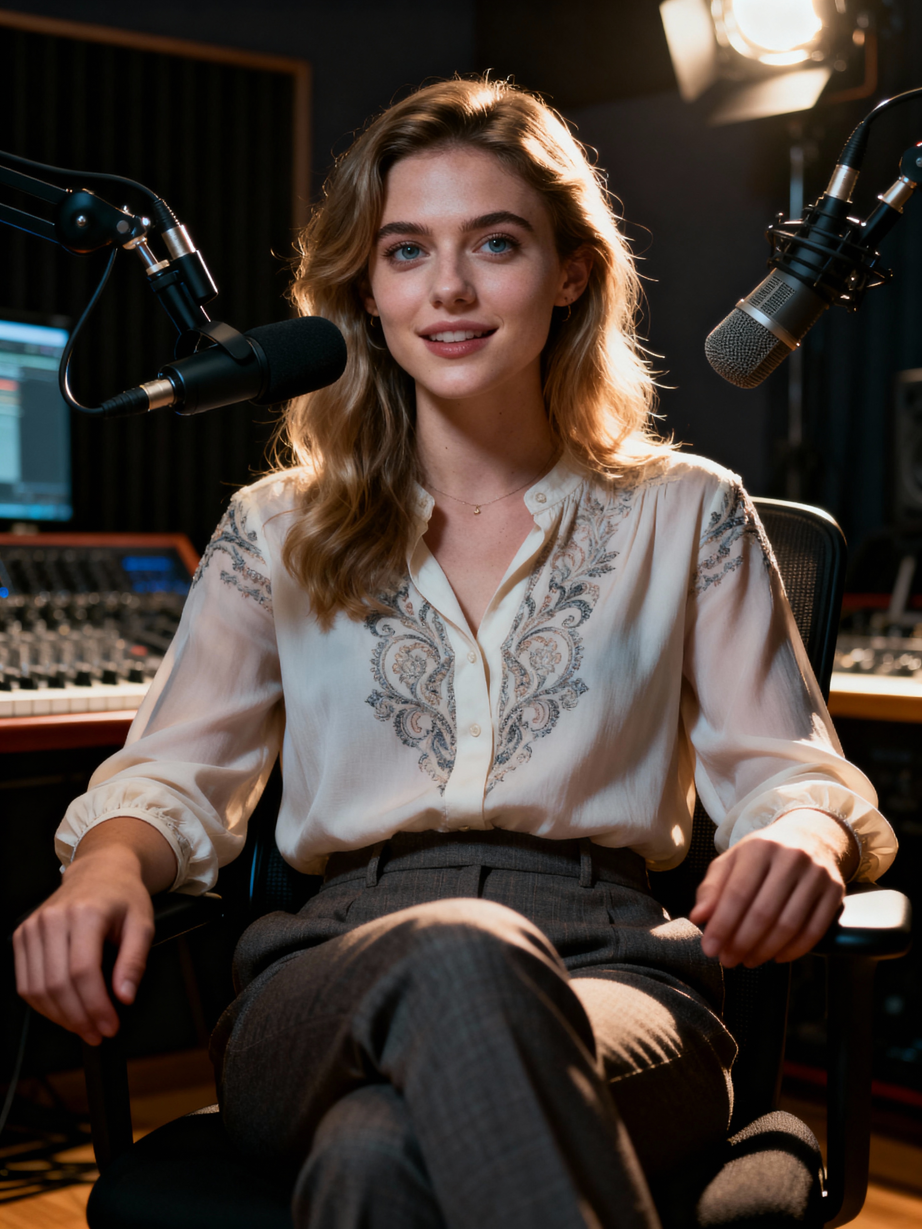 charismatic model dressed in chic blouse with tailored pants being interviewed, podcast studio setting, relaxed professional look
