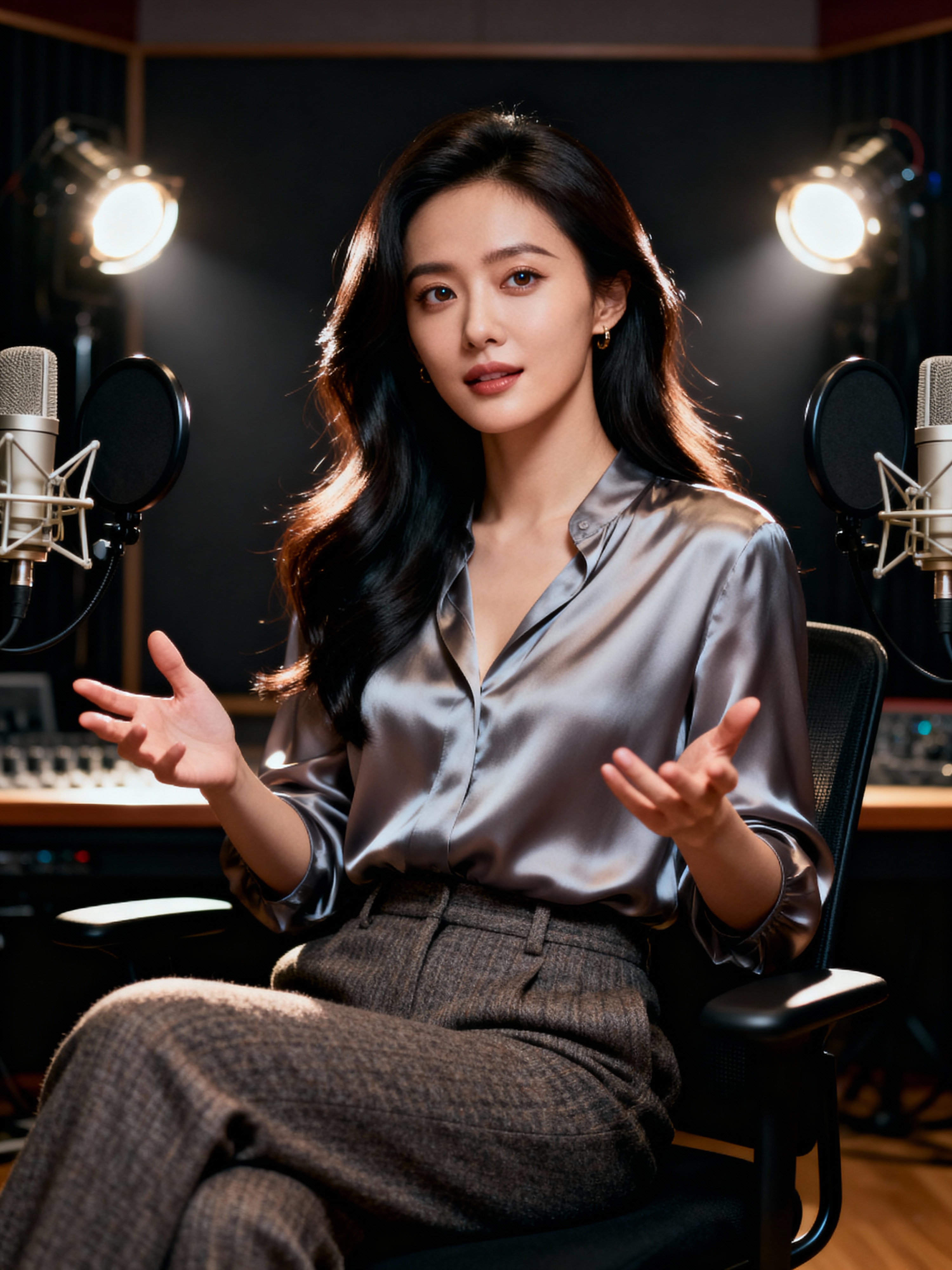 charismatic model dressed in chic blouse with tailored pants being interviewed, podcast studio setting, relaxed professional look