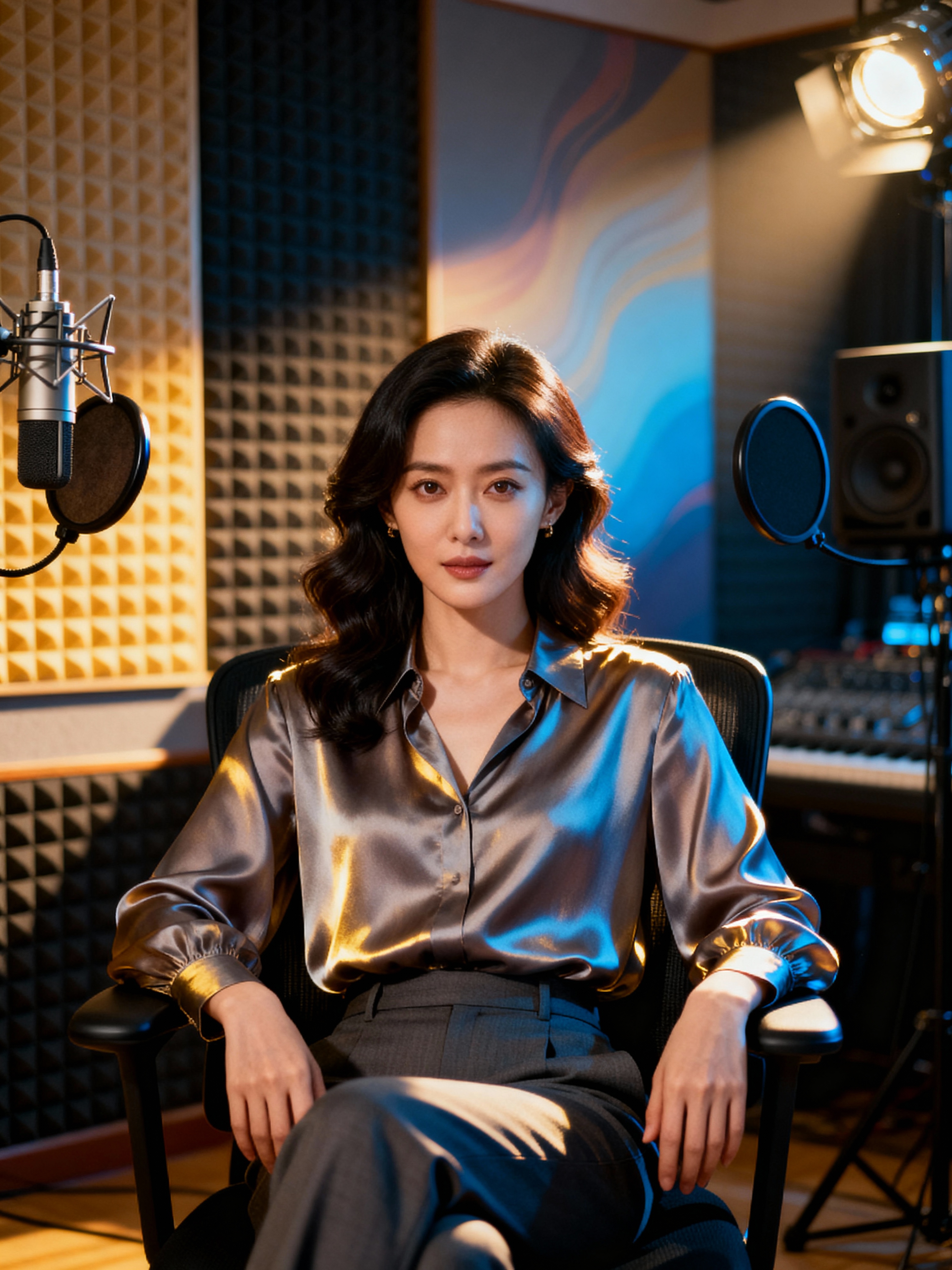 charismatic model dressed in chic blouse with tailored pants being interviewed, podcast studio setting, relaxed professional look
