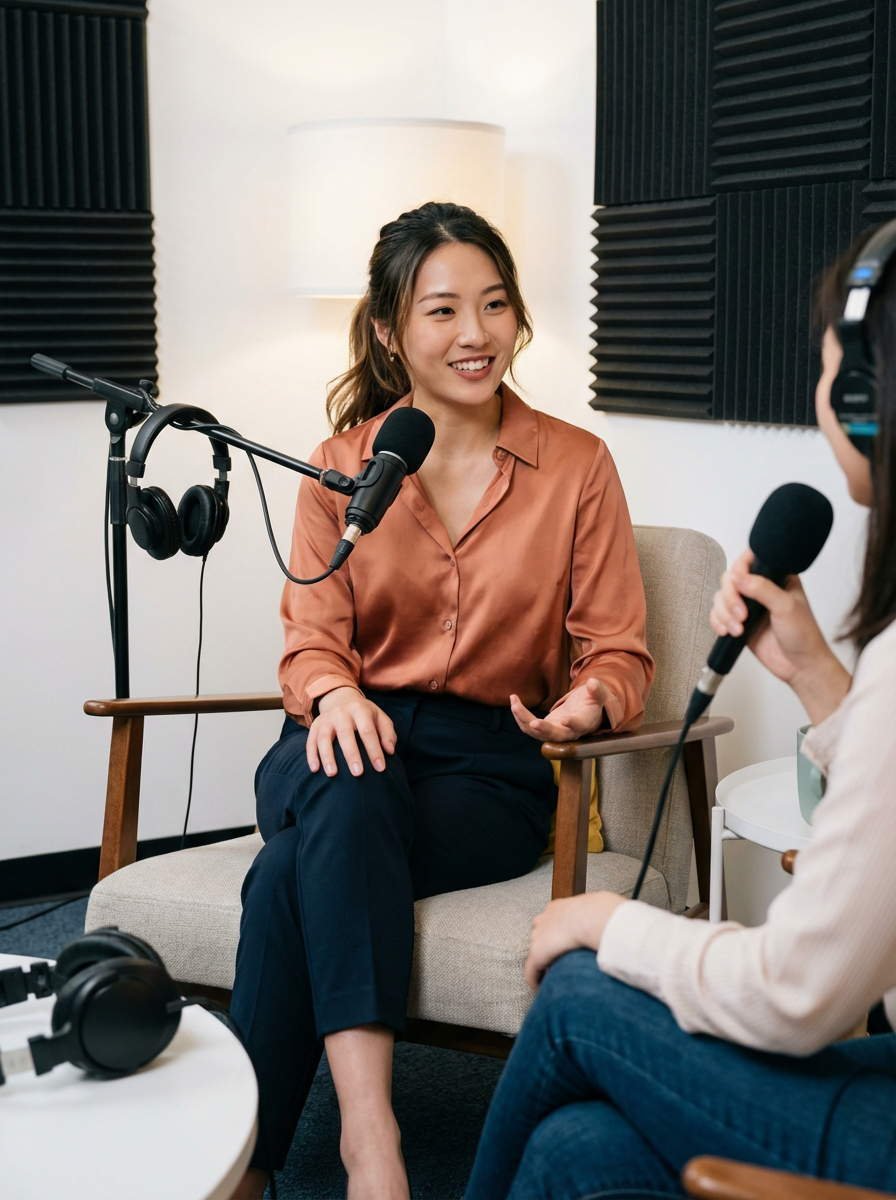 charismatic model dressed in chic blouse with tailored pants being interviewed, podcast studio setting, relaxed professional look