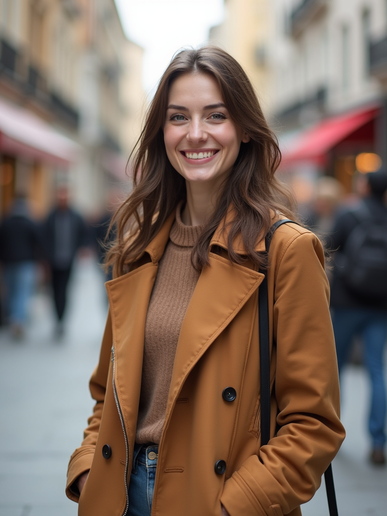 charming feminine model dressed for a comfortable city stroll, capturing genuine smiles