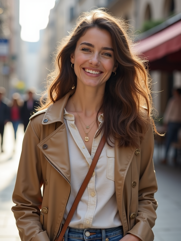 charming feminine model dressed for a comfortable city stroll, capturing genuine smiles