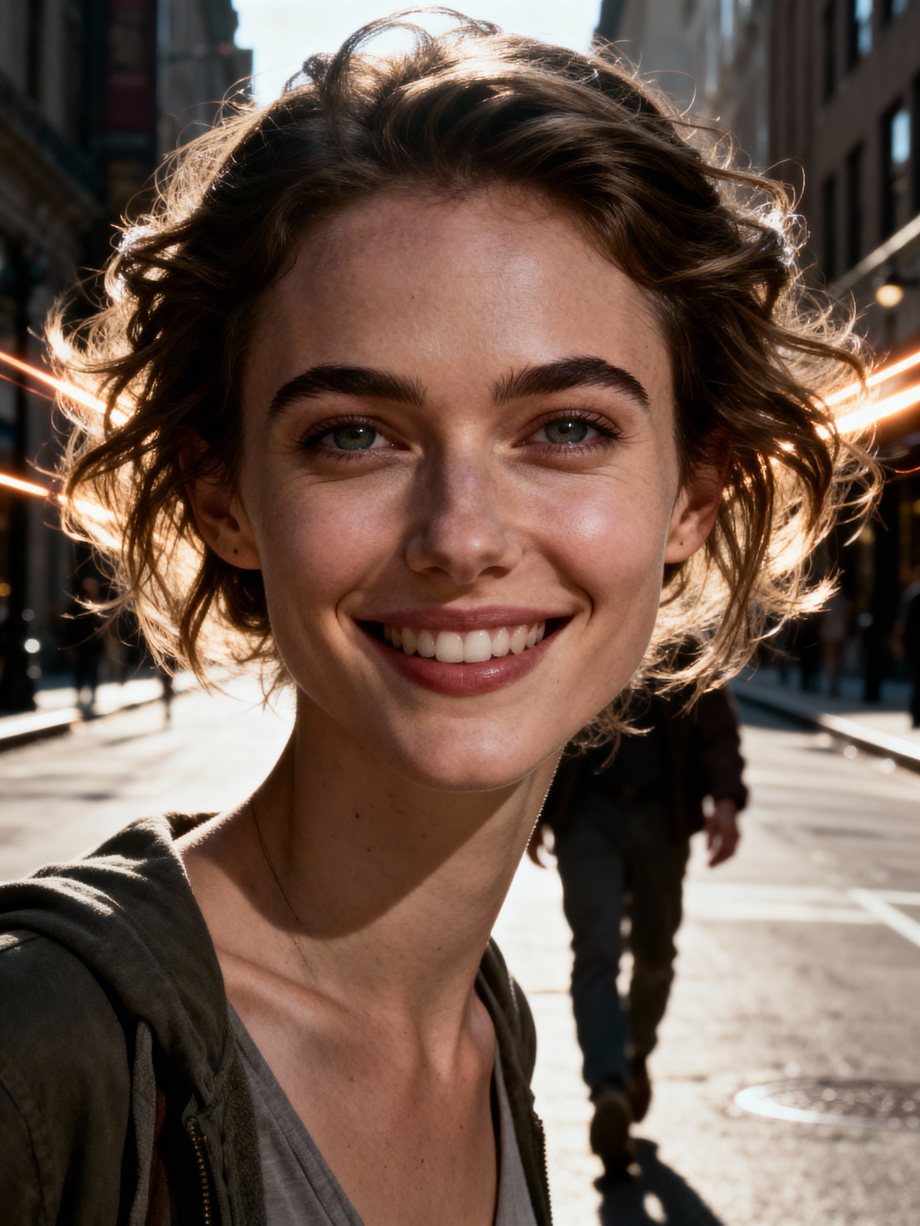 charming feminine model dressed for a comfortable city stroll, capturing genuine smiles