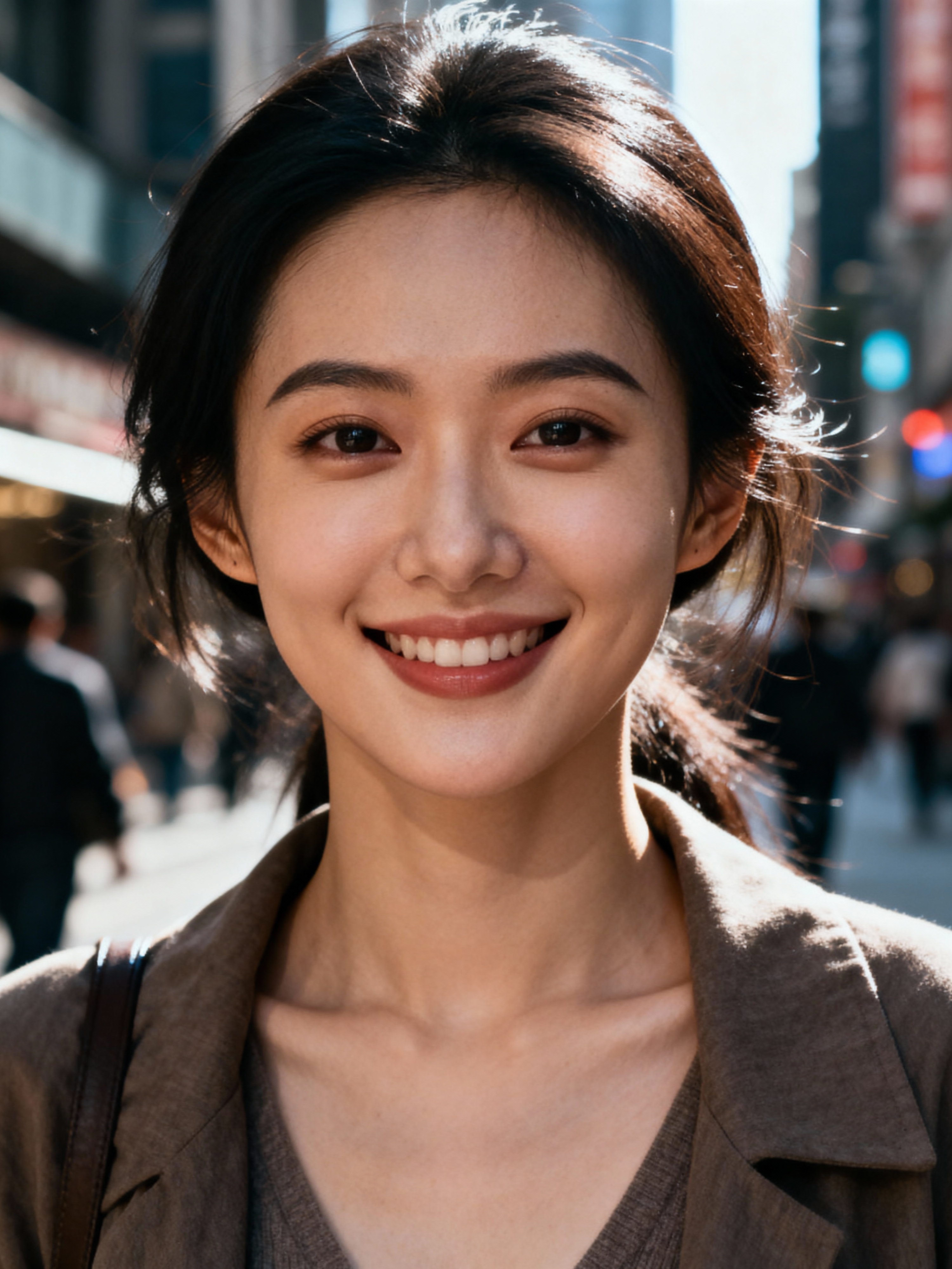 charming feminine model dressed for a comfortable city stroll, capturing genuine smiles