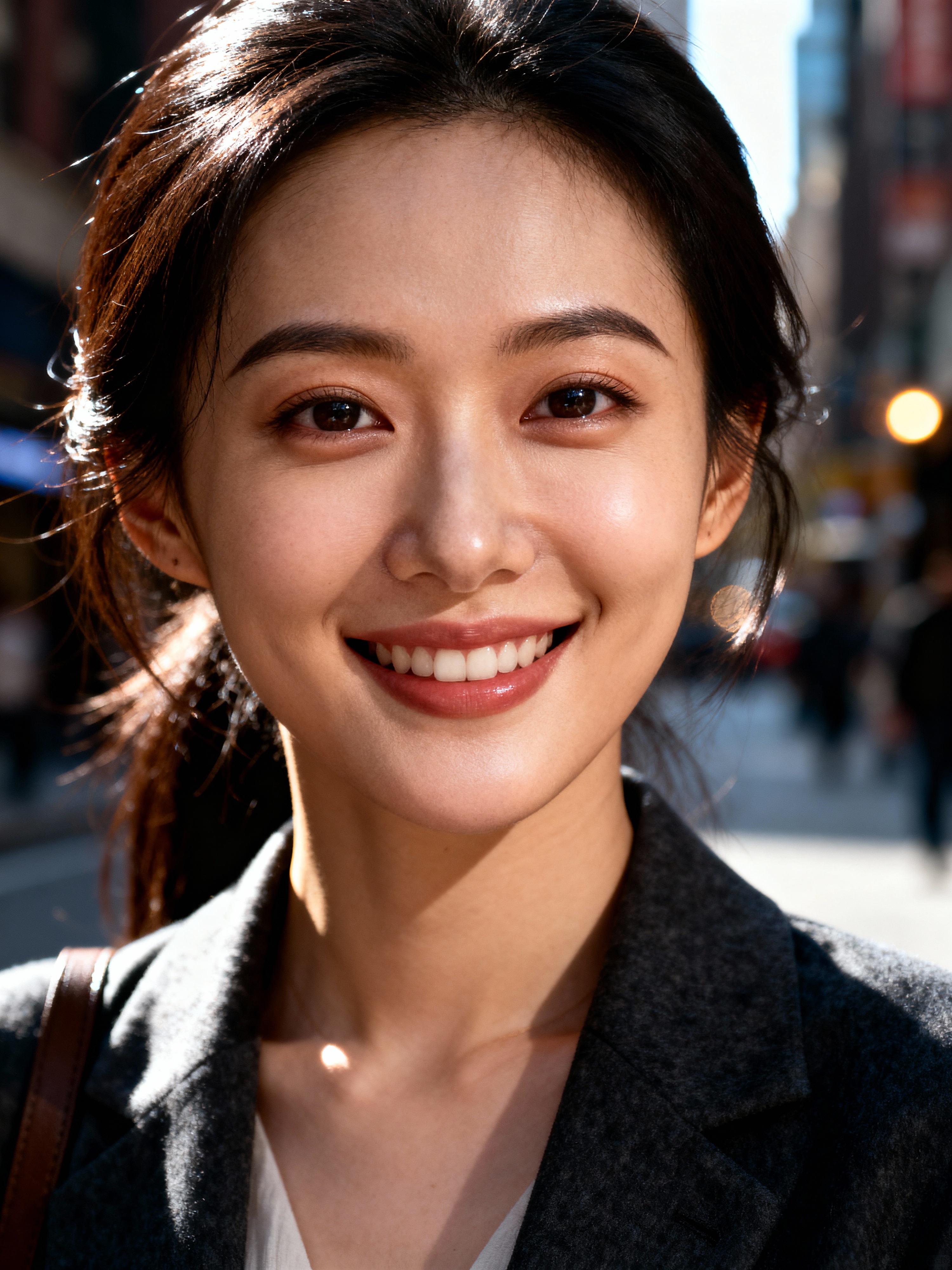 charming feminine model dressed for a comfortable city stroll, capturing genuine smiles