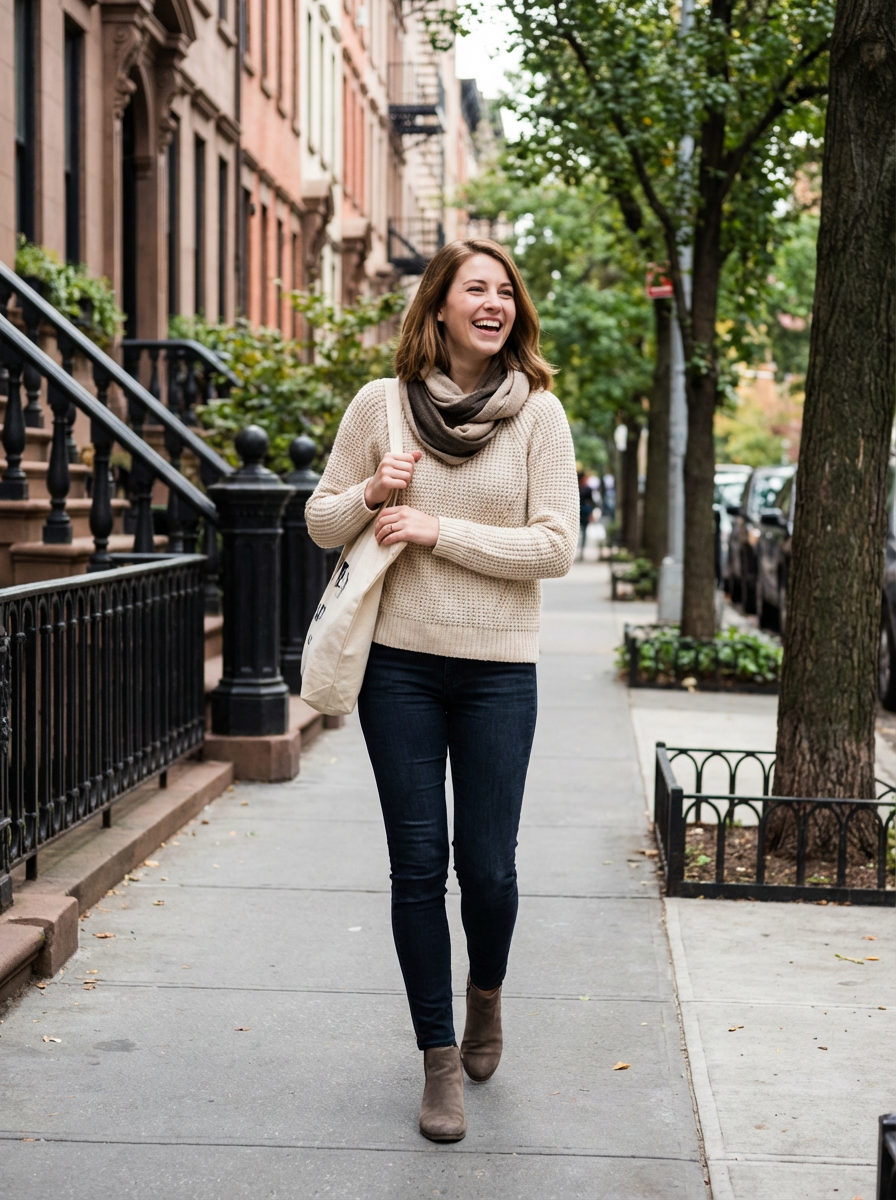 charming feminine model dressed for a comfortable city stroll, capturing genuine smiles