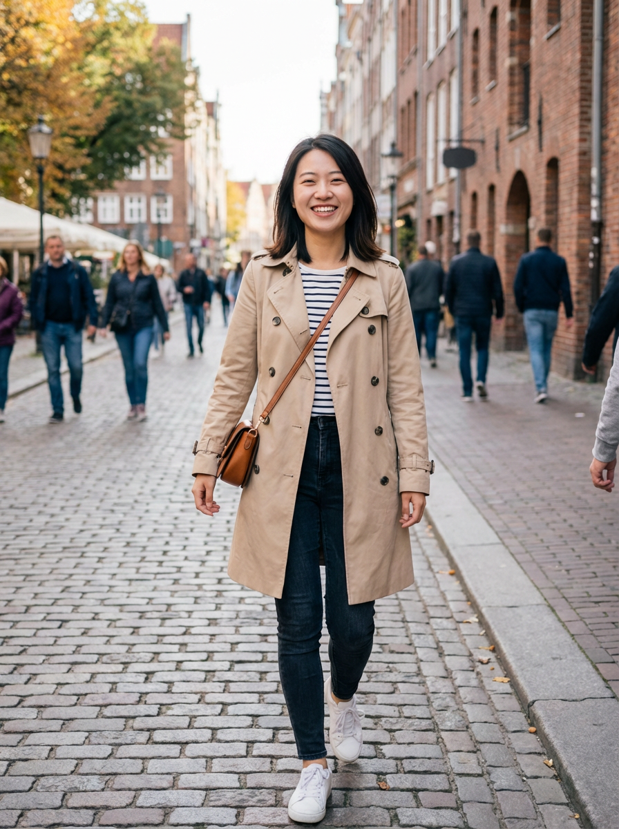 charming feminine model dressed for a comfortable city stroll, capturing genuine smiles