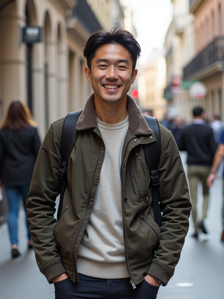 charming masculine model dressed for a comfortable city stroll, capturing genuine smiles