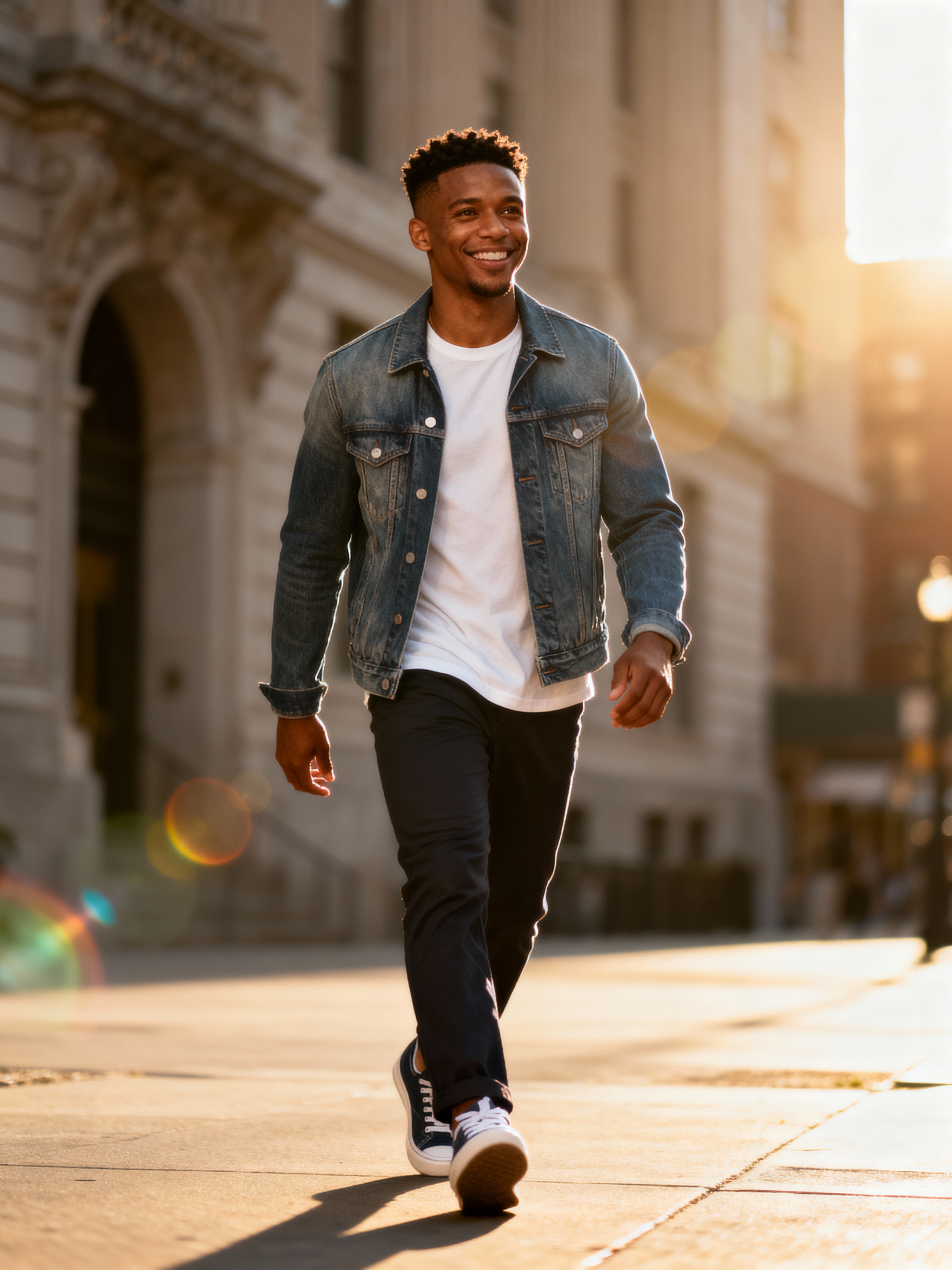 charming masculine model dressed for a comfortable city stroll, capturing genuine smiles