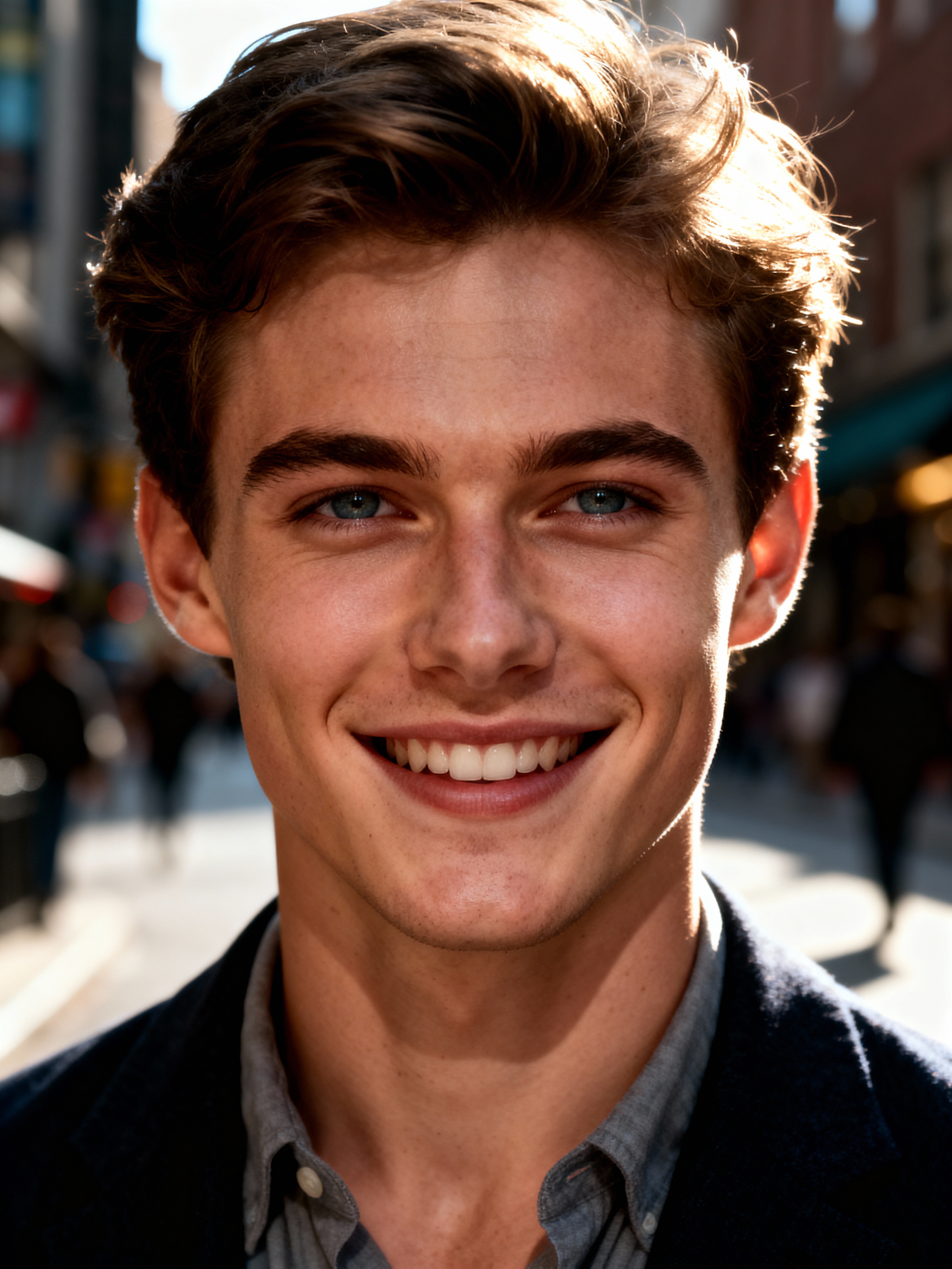 charming masculine model dressed for a comfortable city stroll, capturing genuine smiles