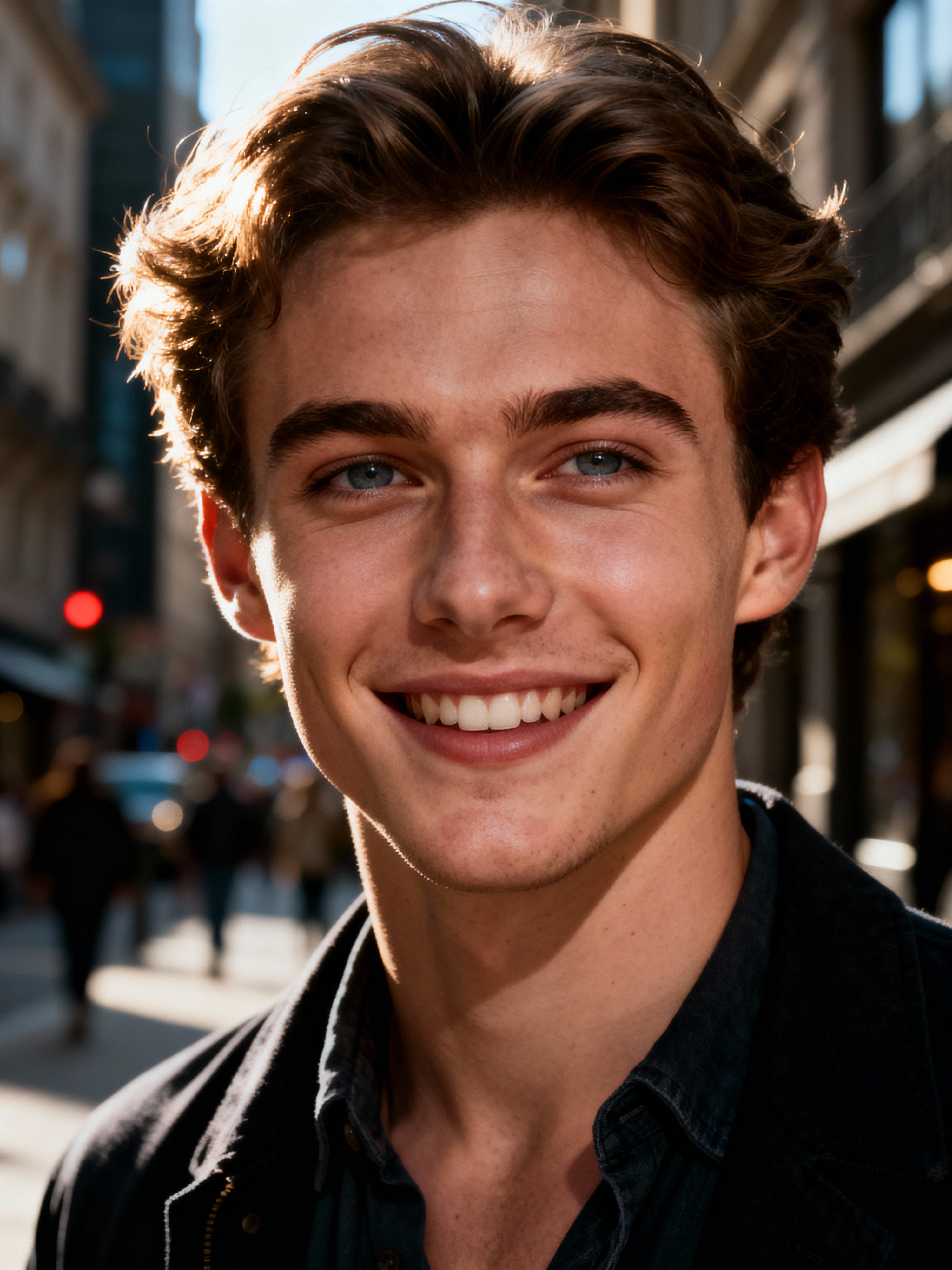 charming masculine model dressed for a comfortable city stroll, capturing genuine smiles