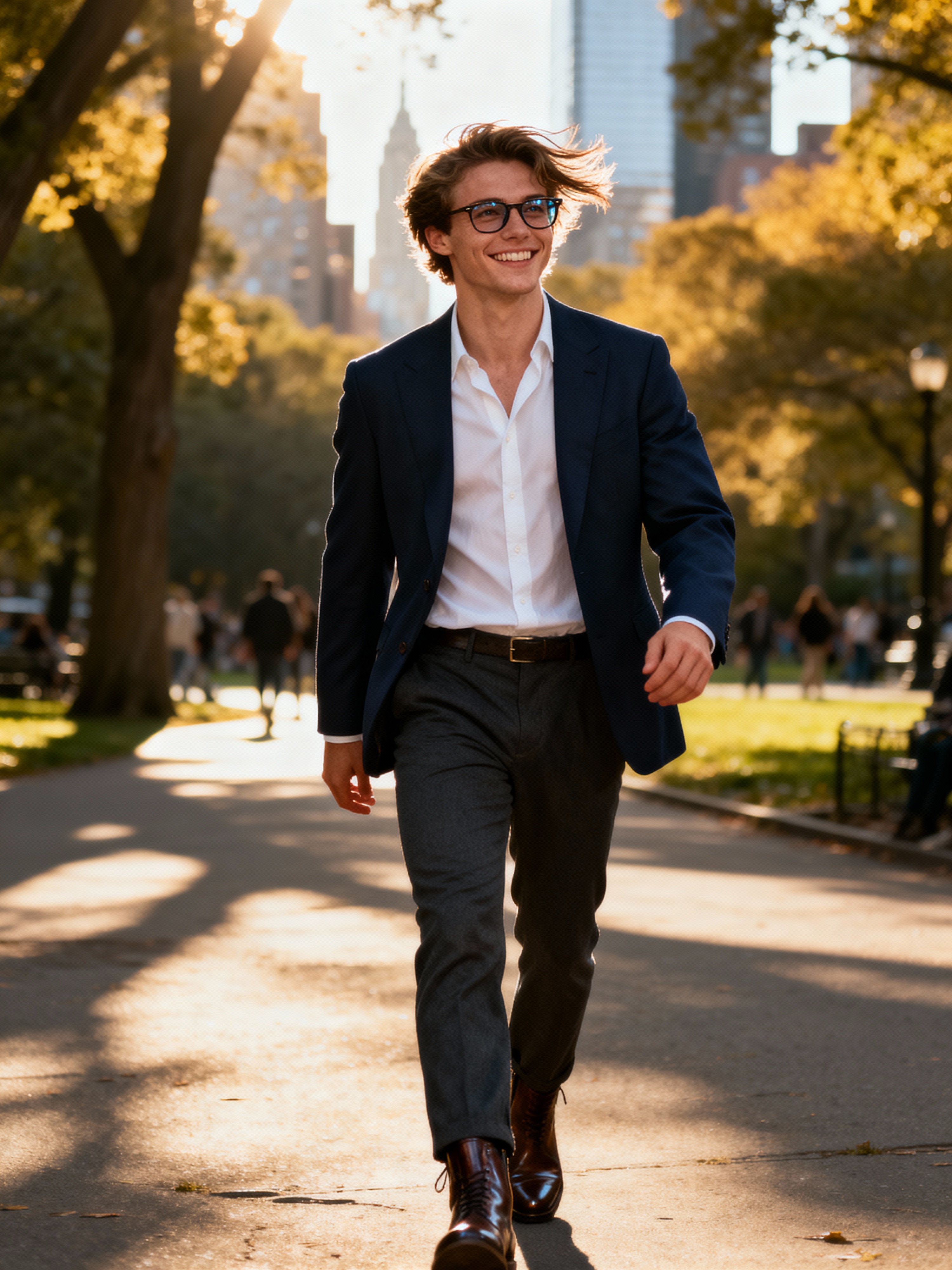 charming masculine model dressed for a comfortable city stroll, capturing genuine smiles