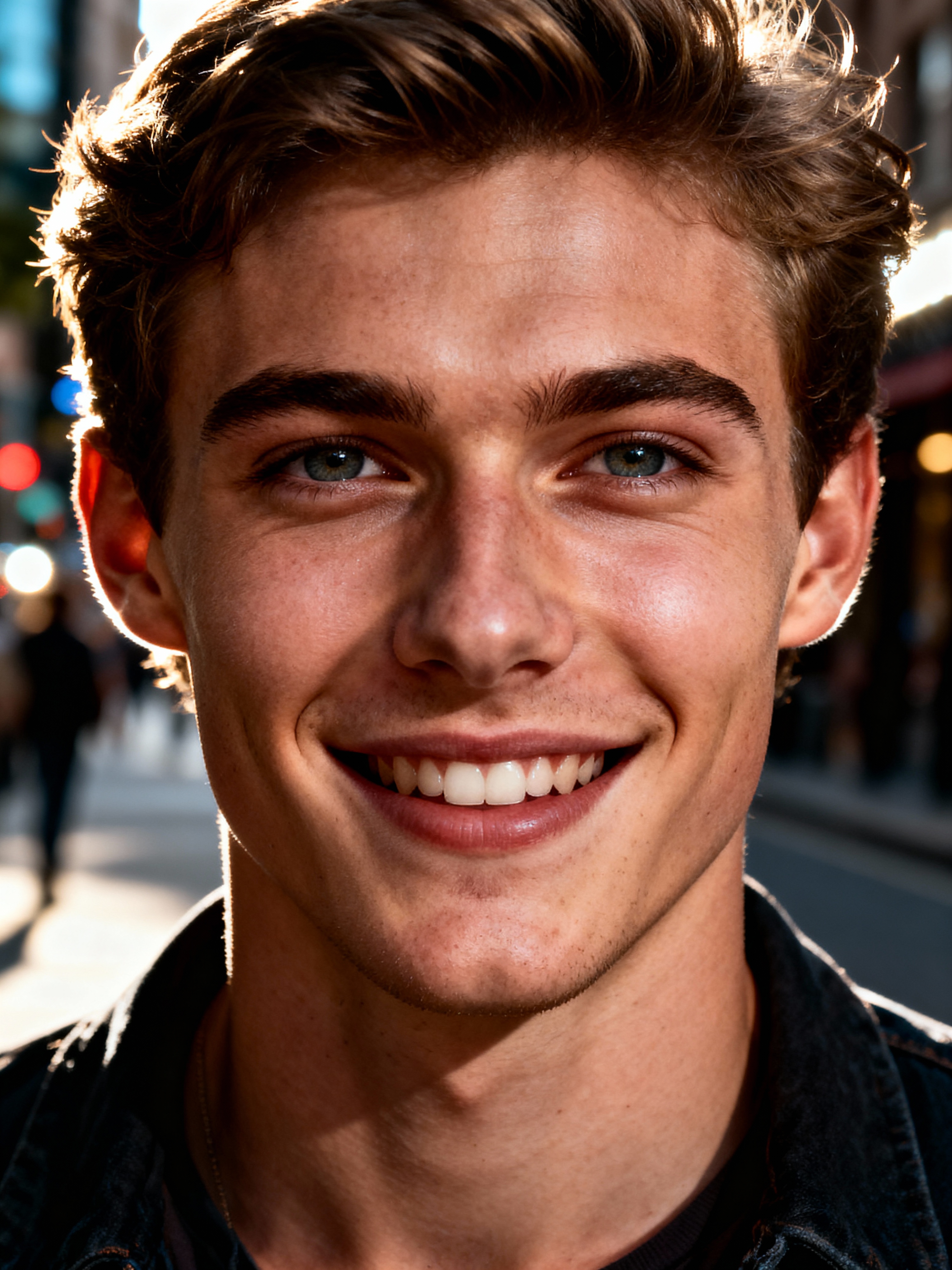 charming masculine model dressed for a comfortable city stroll, capturing genuine smiles
