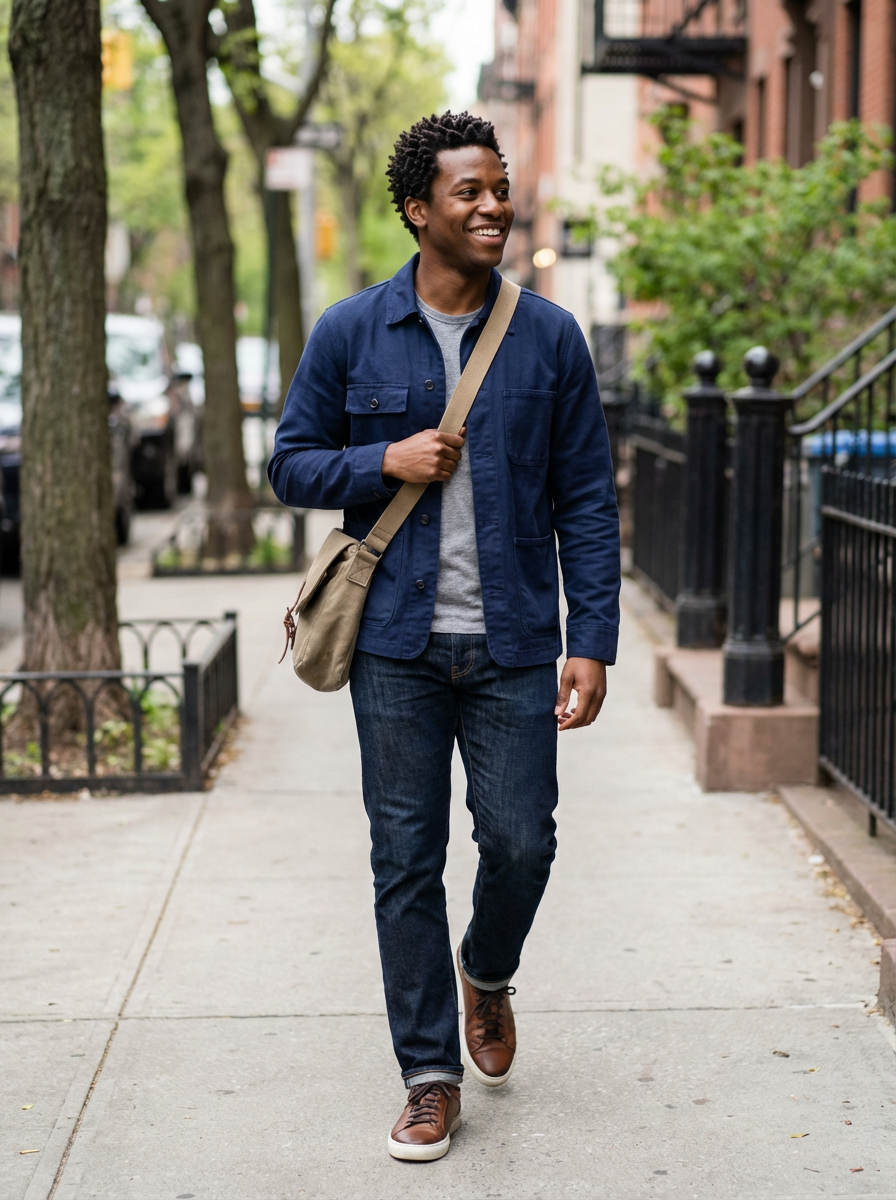 charming masculine model dressed for a comfortable city stroll, capturing genuine smiles