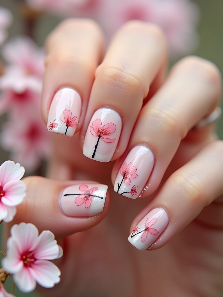 cherry blossom themed nails with delicate pink flowers, spring-inspired design, soft natural lighting, close-up on intricate details