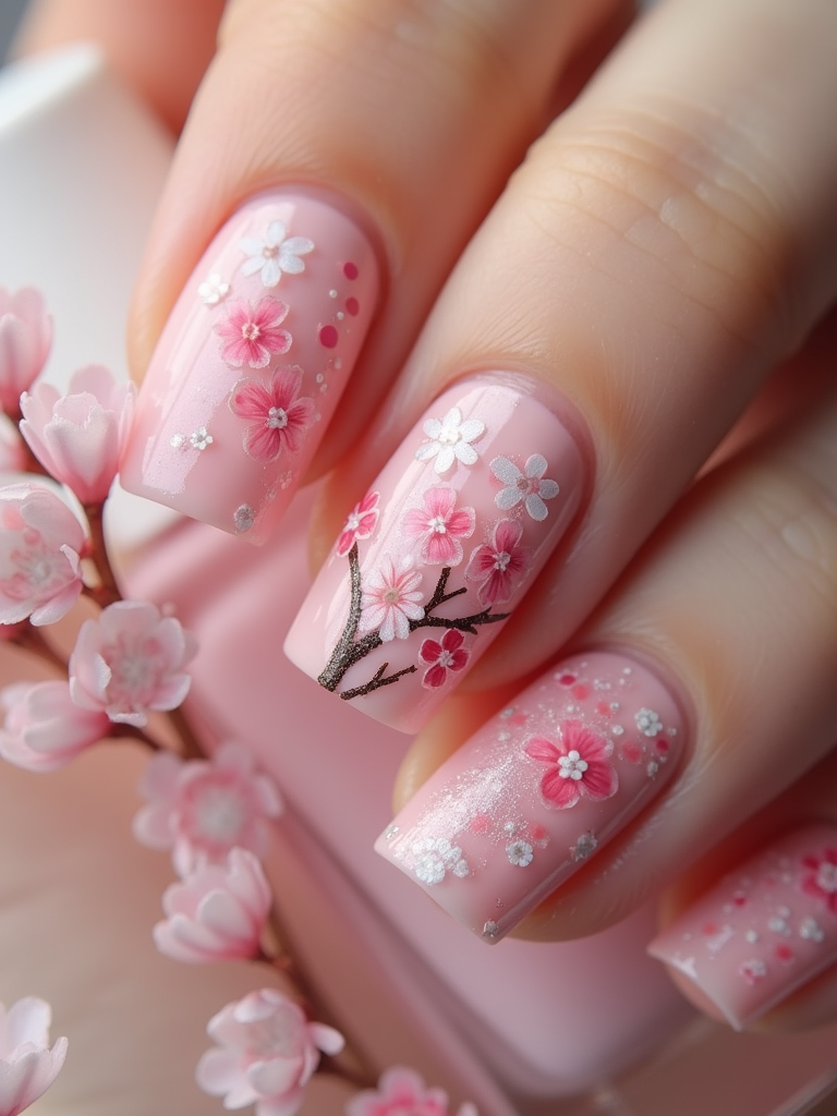 cherry blossom themed nails with delicate pink flowers, spring-inspired design, soft natural lighting, close-up on intricate details