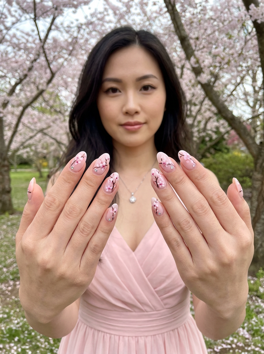 cherry blossom themed nails with delicate pink flowers, spring-inspired design, soft natural lighting, close-up on intricate details