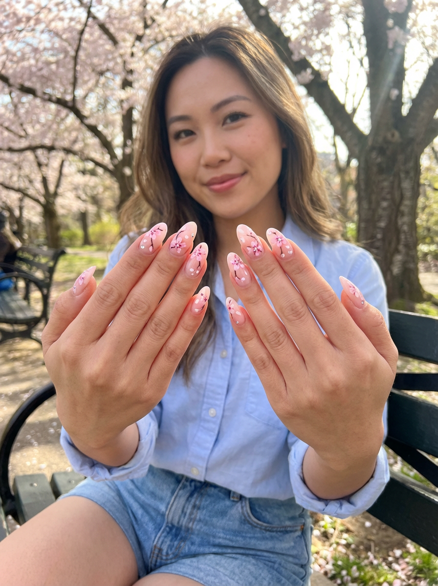cherry blossom themed nails with delicate pink flowers, spring-inspired design, soft natural lighting, close-up on intricate details