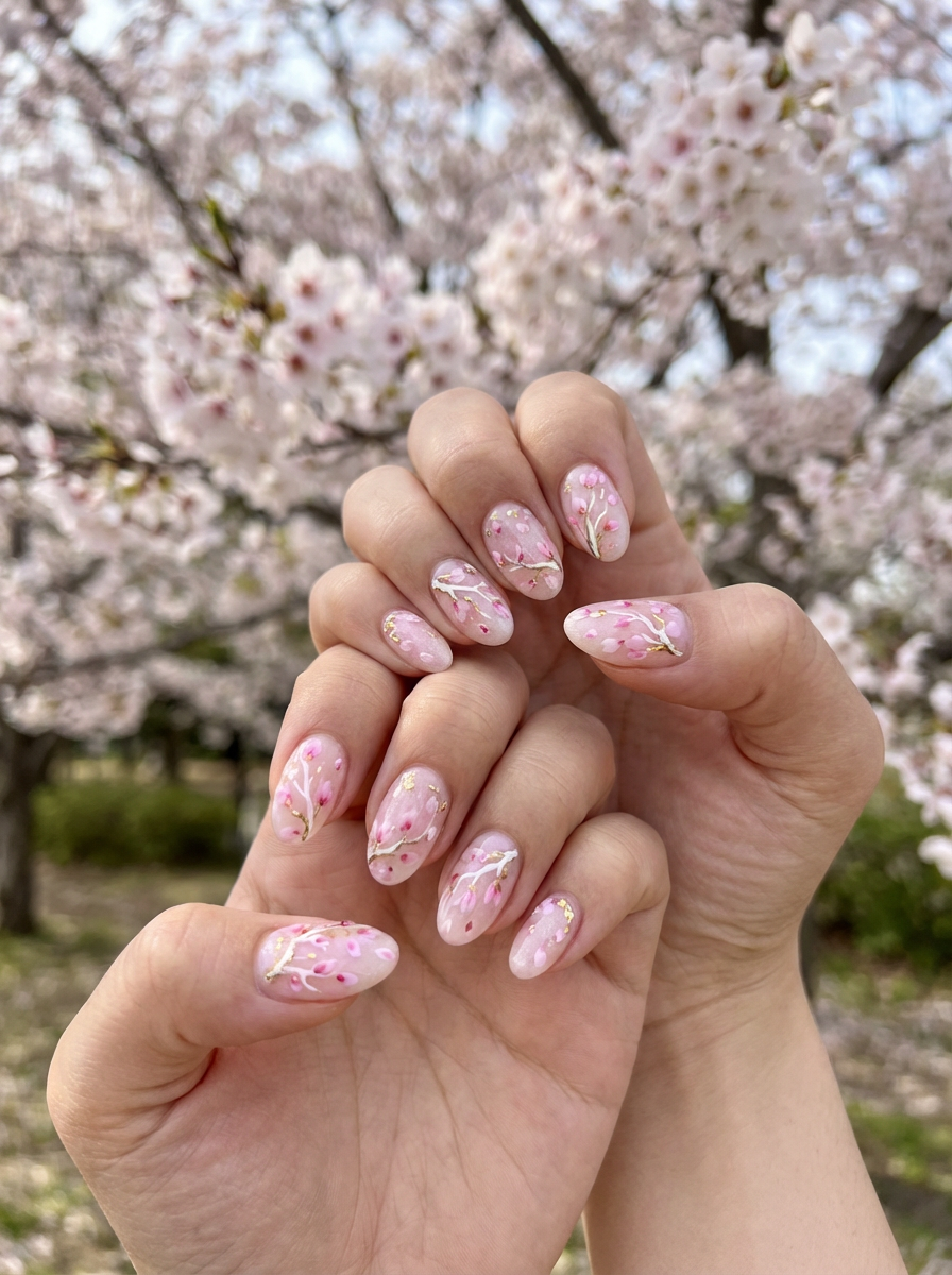 cherry blossom themed nails with delicate pink flowers, spring-inspired design, soft natural lighting, close-up on intricate details