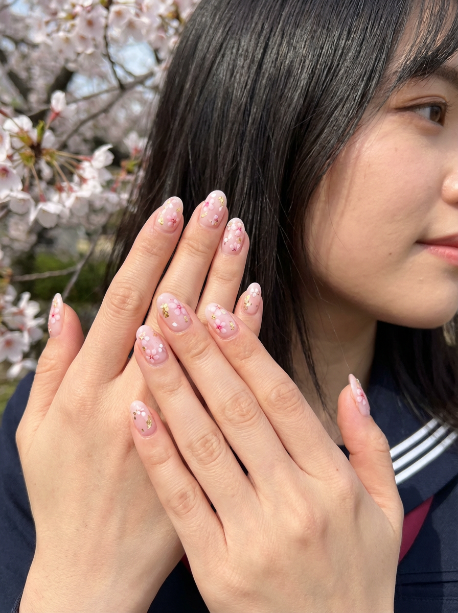 cherry blossom themed nails with delicate pink flowers, spring-inspired design, soft natural lighting, close-up on intricate details