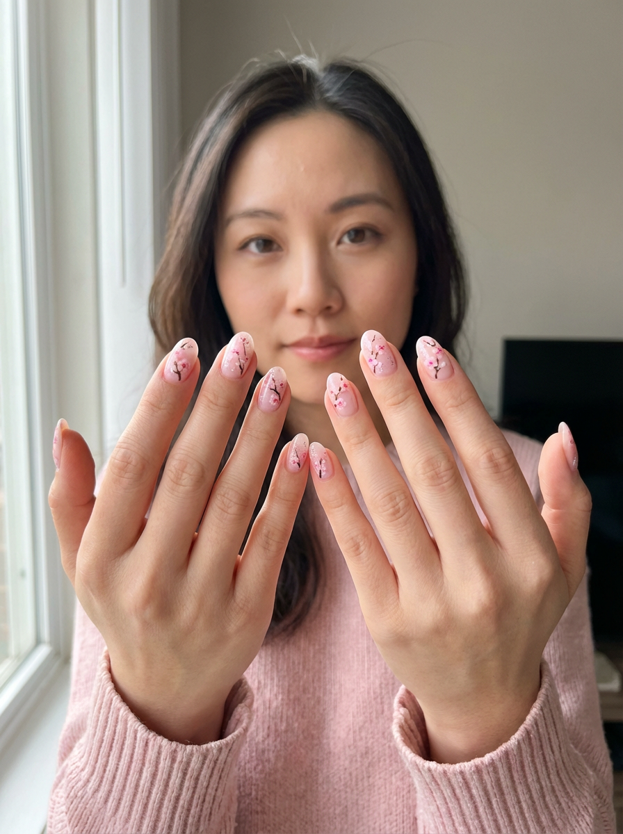 cherry blossom themed nails with delicate pink flowers, spring-inspired design, soft natural lighting, close-up on intricate details