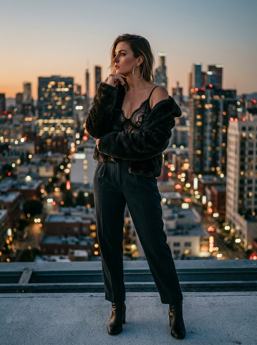 Chic Victoria's Secret model with hand on chin, oversized hoop earrings dangling, fur jacket slipping off shoulders over lace lingerie, urban rooftop at dusk, city lights backdrop, profile three-quarter shot, sophisticated makeup, confident poise, high-fashion magazine cover vibe., large