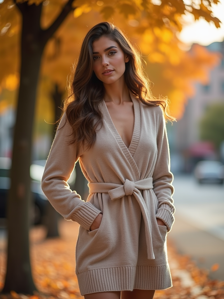 chic model wearing a nude-toned sweater dress with a belt, standing near autumn trees, soft golden hour lighting, cozy and elegant look, urban backdrop