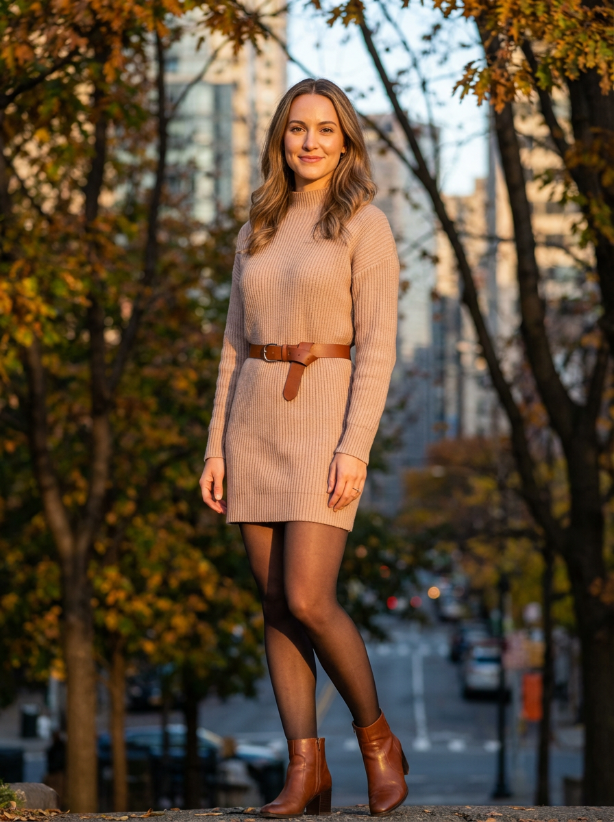 chic model wearing a nude-toned sweater dress with a belt, standing near autumn trees, soft golden hour lighting, cozy and elegant look, urban backdrop