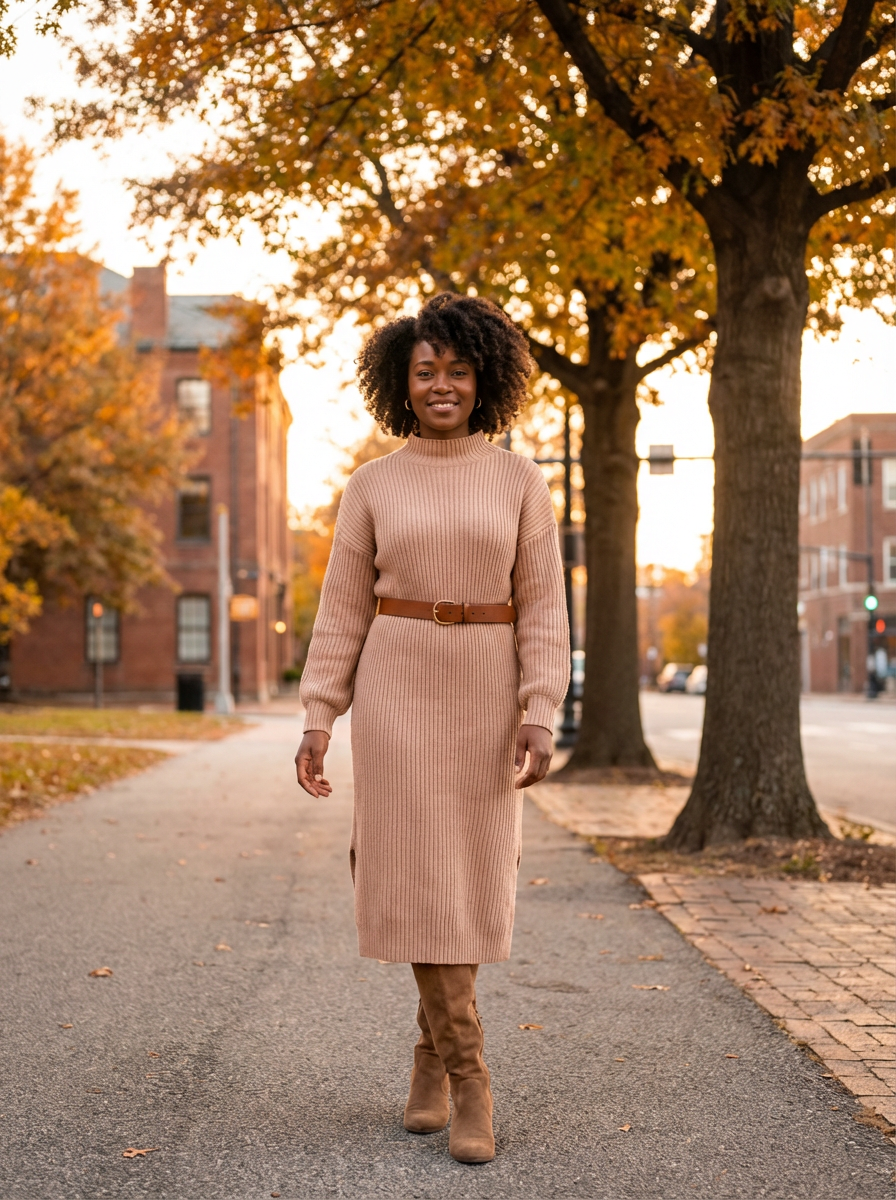 chic model wearing a nude-toned sweater dress with a belt, standing near autumn trees, soft golden hour lighting, cozy and elegant look, urban backdrop