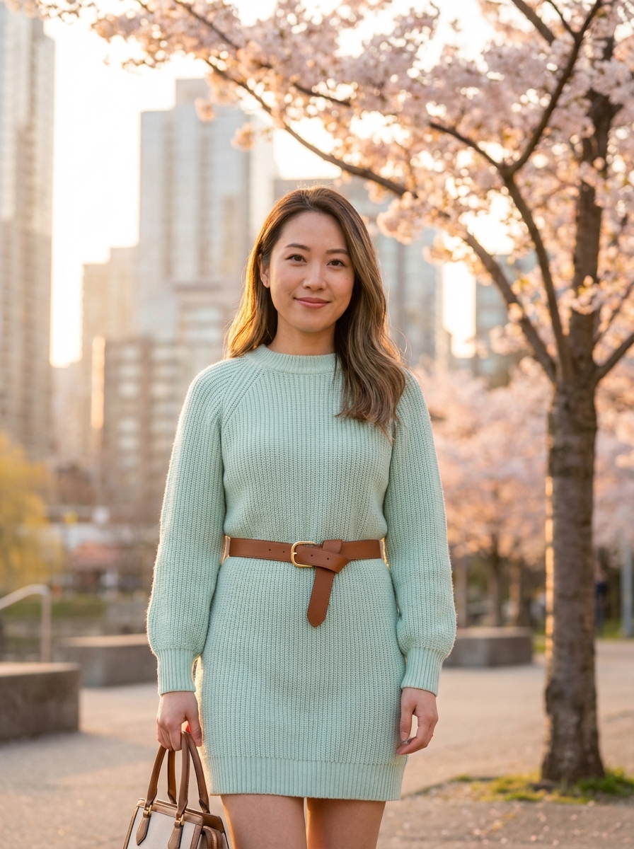 chic model wearing a pastel mint sweater dress with a belt, standing near spring trees, soft golden hour lighting, cozy and elegant look, urban backdrop