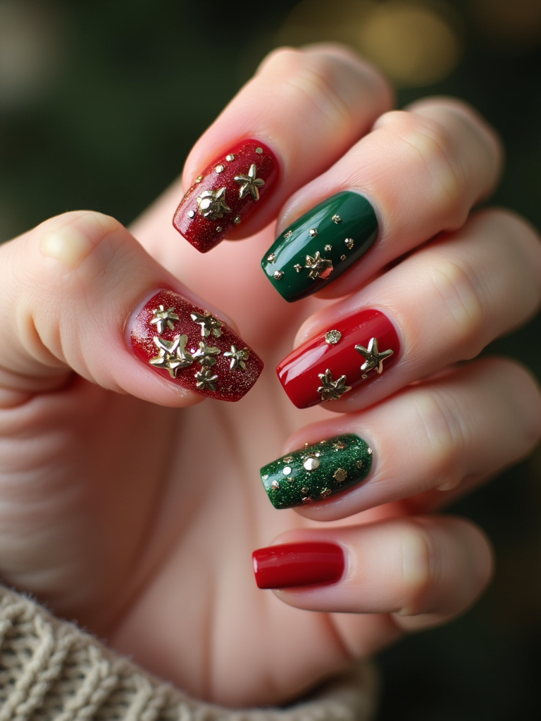 Christmas tree themed nails with tiny ornaments and glitter, festive red and green colors, elegant hand pose, holiday-inspired nail art