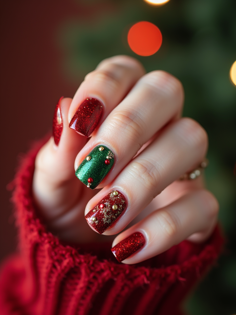 Christmas tree themed nails with tiny ornaments and glitter, festive red and green colors, elegant hand pose, holiday-inspired nail art