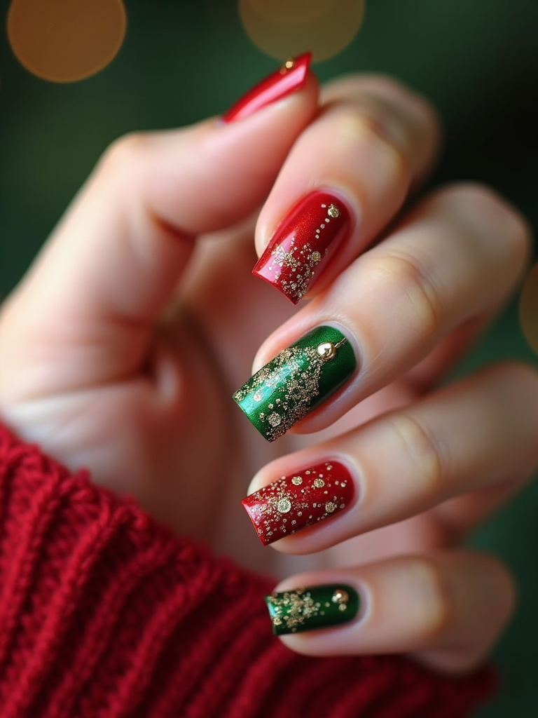 Christmas tree themed nails with tiny ornaments and glitter, festive red and green colors, elegant hand pose, holiday-inspired nail art