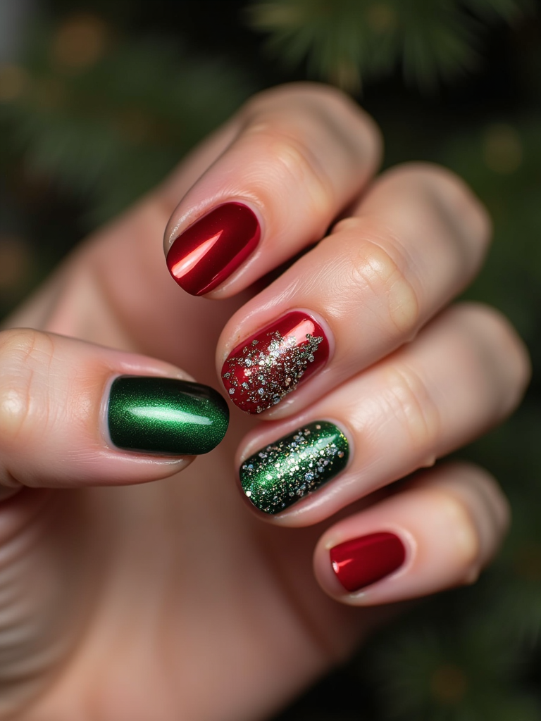 Christmas tree themed nails with tiny ornaments and glitter, festive red and green colors, elegant hand pose, holiday-inspired nail art