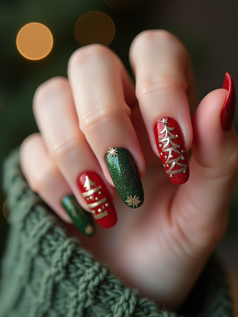 Christmas tree themed nails with tiny ornaments and glitter, festive red and green colors, elegant hand pose, holiday-inspired nail art